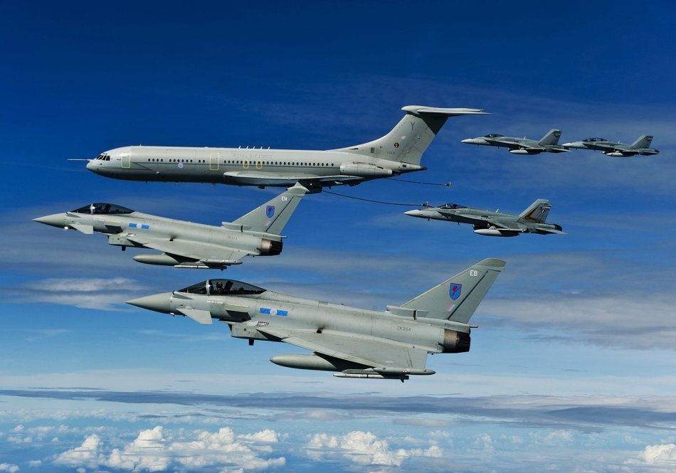イギリス空軍のタイフーンとオーストラリア空軍のF/A-18による空中給油編隊。
