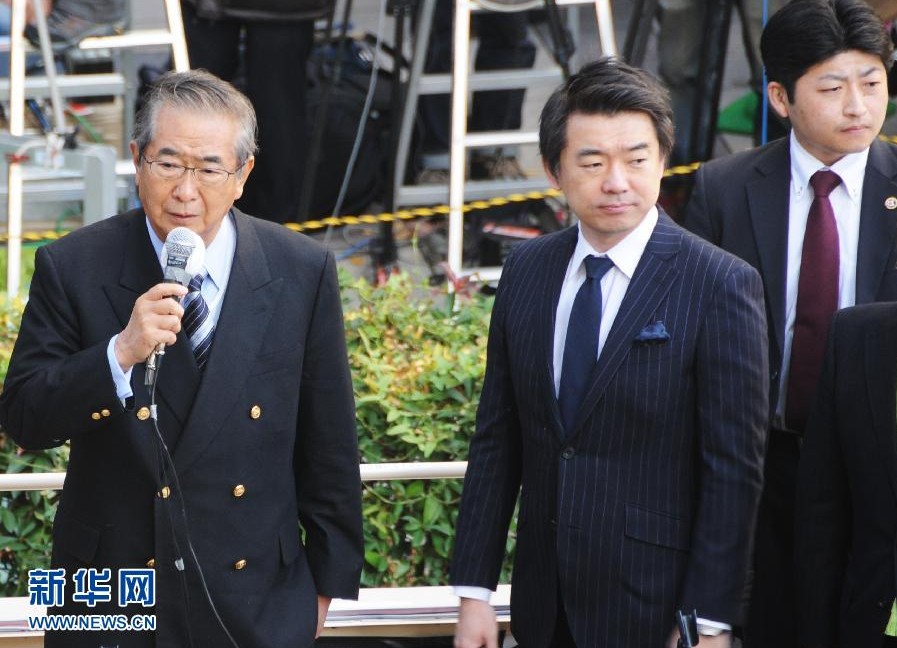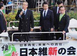 写真は、大阪の梅田の街頭で演説を行う「日本維新の会」の石原慎太郎代表(左から1番目)