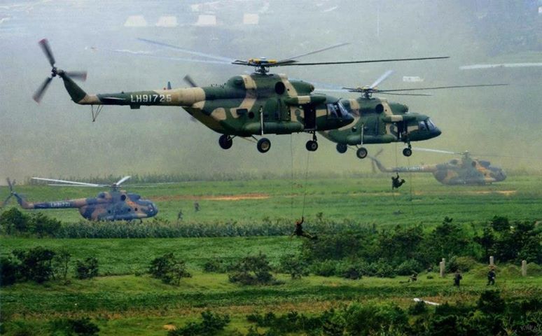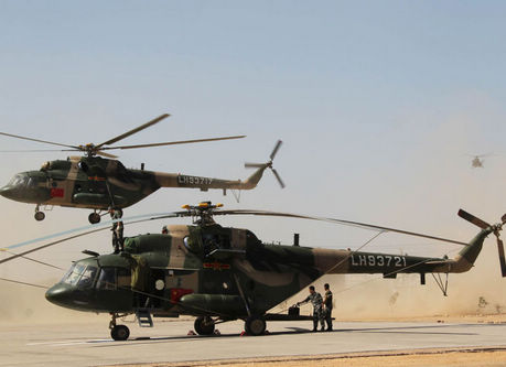 降雪地の高原に駐屯中の、中国空軍航空兵某団のヘリコプター大隊の2機のヘリコプターが、7月21日20時に次々と離陸し、雅魯藏布江峡谷を行き来し、22時33分に飛行を終え無事着陸した。写真は7月21日夜、中国空軍航空兵某団のヘリコプターが、ラサの某空港で訓練を実施する様子。
