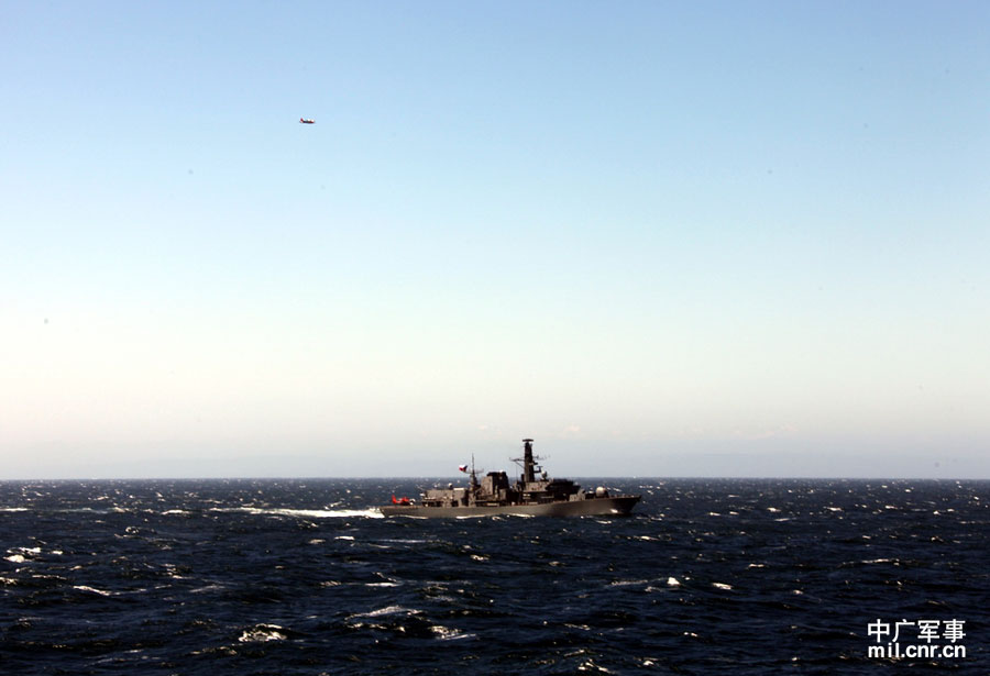 中国海軍の052C型ミサイル駆逐艦「蘭州艦」、054A型フリゲート「柳州艦」から成る艦艇編隊は10日、チリ海軍のフリゲート「アルミランテ・リンチ(旧・英リアンダー級)」と旧オランダのカレルドールマン級のフリゲート、及び航空機5機と共に、海上における合同軍事演習を行った。
