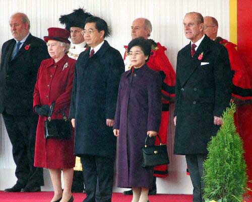 2005年11月8日、英王室騎兵観閲場でエリザベス女王の催した歓迎式典に出席する胡錦濤国家主席と劉永清夫人。