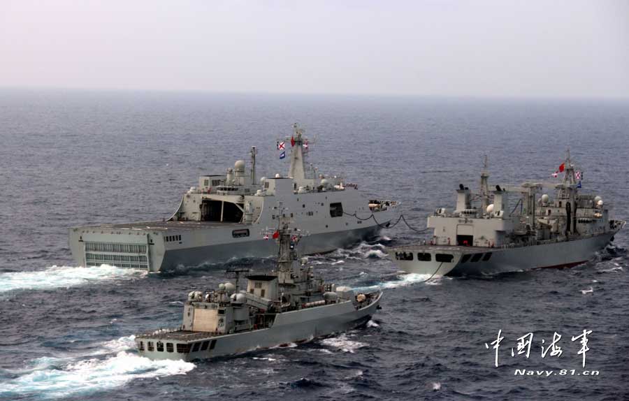 3月17日午後、南中国海の某海域は波しぶきに包まれていた。14時30分、総合補給艦「千島湖艦」は、マレーシア不明機を捜索中の揚陸艦「井岡山艦」、「崑崙山艦」、ミサイル護衛艦「綿陽艦」、遠洋救助船「永興島号」と合流し、井岡山艦、綿陽艦に燃料を補給し、艦載ヘリで垂直物資補給を実施した。崑崙山艦と永興島号は、千島湖の左舷・右舷で警戒に当たった。