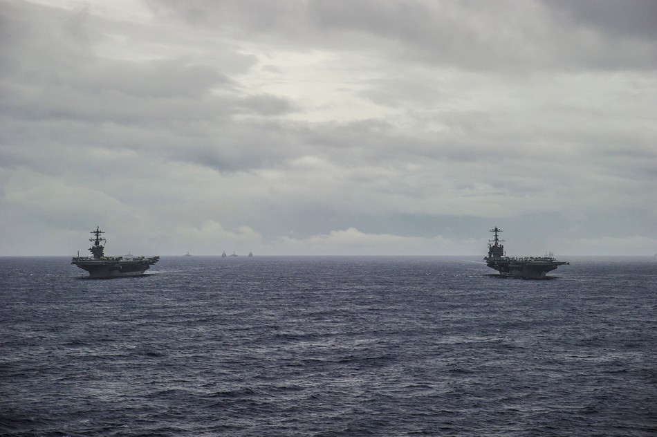 米海軍の演習 2隻の空母が戦闘機と編隊形成