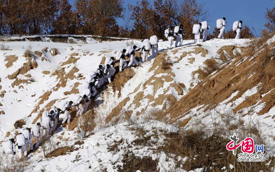 黒龍江省軍区某国境警備団機動歩兵連隊の兵士は1月28日、マイナス26度の極寒の中で山を越え、長距離の野営訓練を実施した。