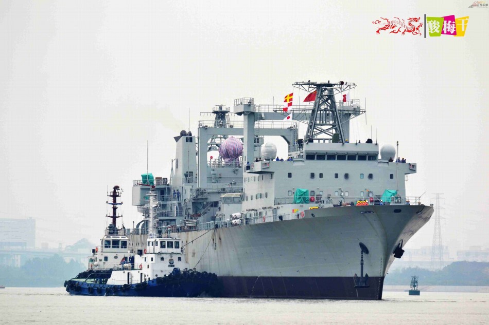 タグボートに引かれる間もなく試験航行に向かう新型総合補給艦の5番艦…