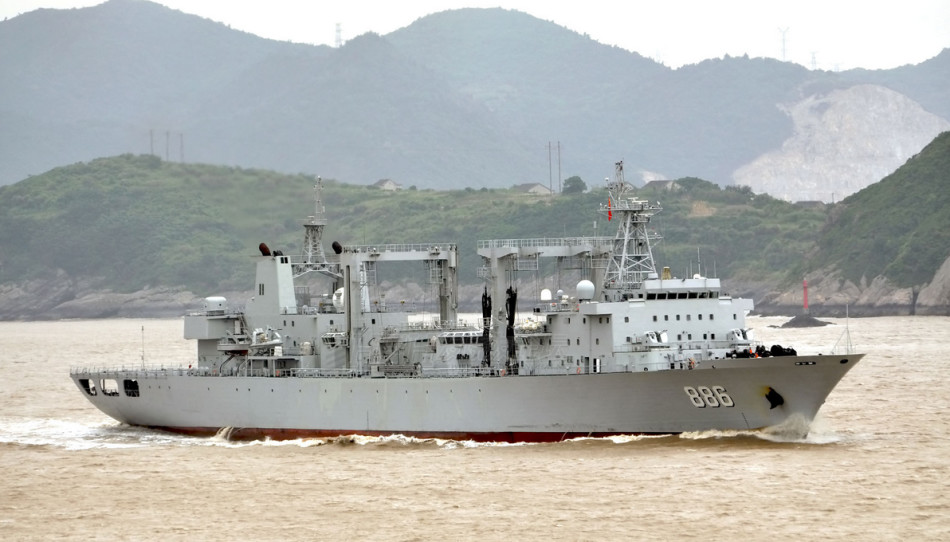 タグボートに引かれる間もなく試験航行に向かう新型総合補給艦の5番艦…