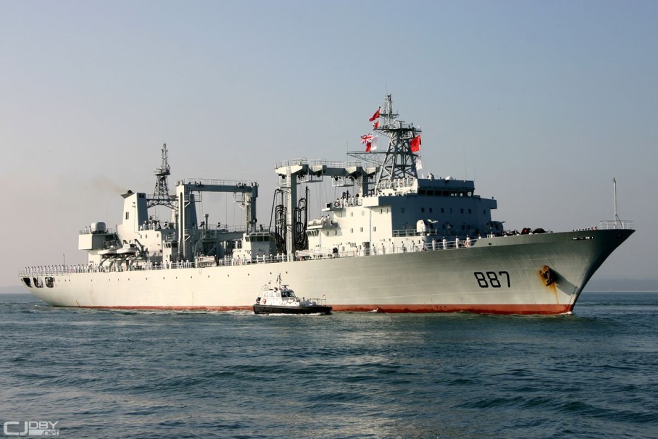 タグボートに引かれる間もなく試験航行に向かう新型総合補給艦の5番艦…
