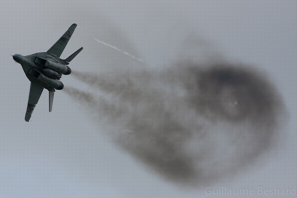 MiG-29、曲芸飛行で黒煙を吐く