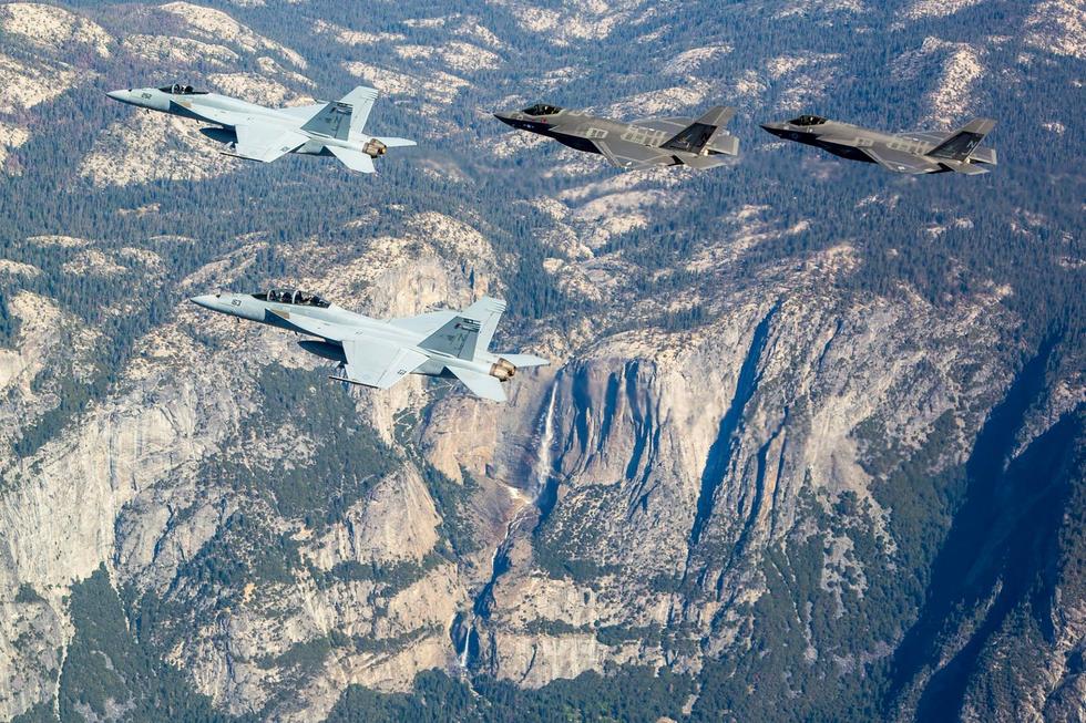 F-35とF-18による戦闘機編隊が山脈を飛び越える