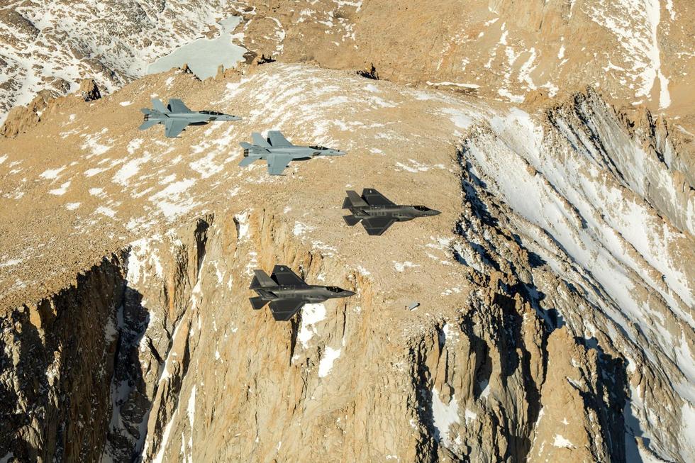 F-35とF-18による戦闘機編隊が山脈を飛び越える