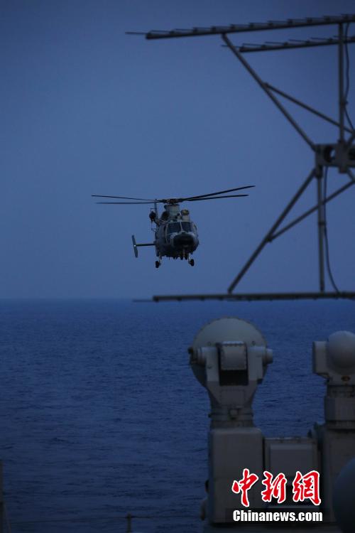 4月19日、インド洋に夕日が沈み、赤い夕焼けが広がった。第20期護衛航行艦隊の済南艦、益陽艦の艦載ヘリは現地時間17時、旋回音と共に飛行甲板から夜空に飛び立ち、今回初となる航行中の昼夜を分かたぬ2機同時飛行訓練を実施した。