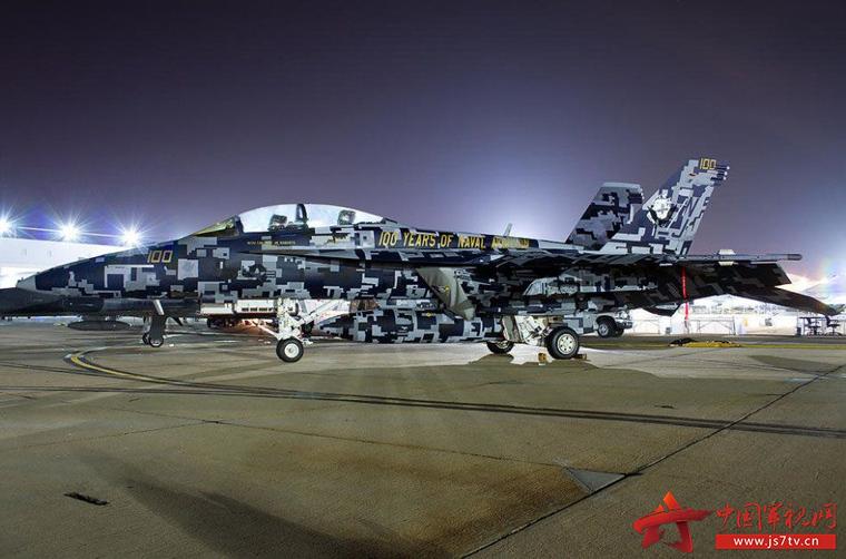 米海軍のF/A-18戦闘攻撃機。米海軍航空隊100周年記念のマークに注目。