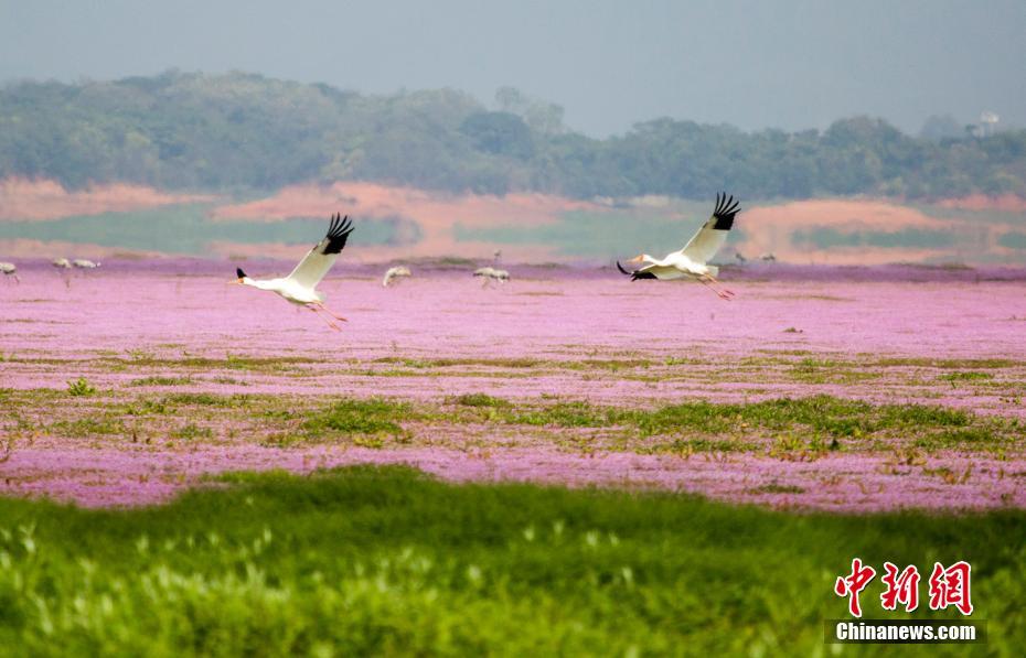 11月13日に伝えられたところによると、立冬が過ぎてから、ソデグロヅル、クロヅル、サカツラガンなどの渡り鳥数万羽が越冬のために江西省九江市のハ陽湖湿地に飛来している。