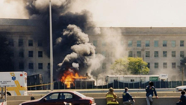 米連邦捜査局(FBI)は3月30日、2001年9月11日に発生した米同時多発テロ事件で米国防総省の襲撃数時間後を撮った写真を初公開した。写真は、路上障害物の後ろに隠れる消防隊員とFBI隊員。ペンタゴンが炎に包まれ、彼らはさらなる襲撃があるかどうかもわからない。