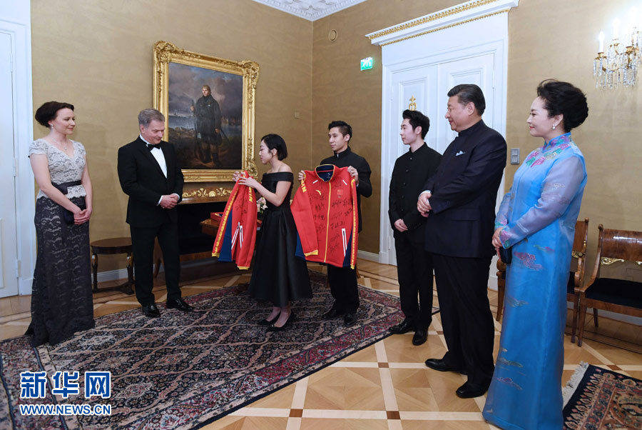中国の選手、ニーニスト大統領とハウキオ夫人にユニフォームを贈呈。