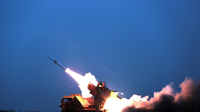 渤海湾の畔で5日未明、中国空軍対地空ミサイル某旅団防空営から発射された数発のミサイルが、海上を低空飛来する「標的」に命中した。写真は標的に向かうミサイル。