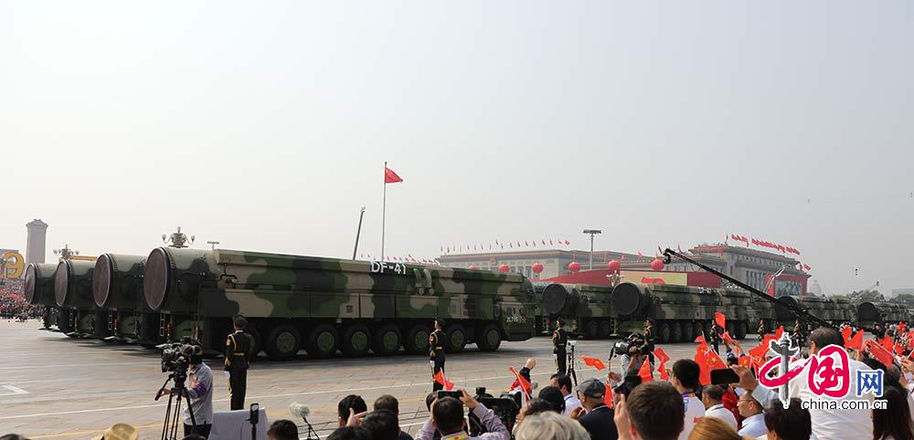 中国ミサイル専門家、量子防衛首席科学者の楊承軍氏は、環球時報のインタビューに応じた際に「新中国成立70周年軍事パレードに登場したDF-41は、中国の次世代戦略核兵器の初公開となった。これは中国現役ミサイル武器装備のうち射程距離が最も長い型式で、世界の戦略的標的をカバーする。中国軍がより効果的に国家安全を守る上で非凡な意義を持つ」と述べた。