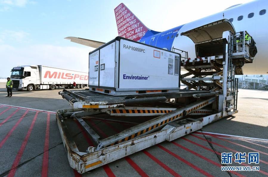 1月16日、セルビアの首都ベオグラードで、第1ロットの中国産新型コロナウイルスワクチンを降ろす空港スタッフ
