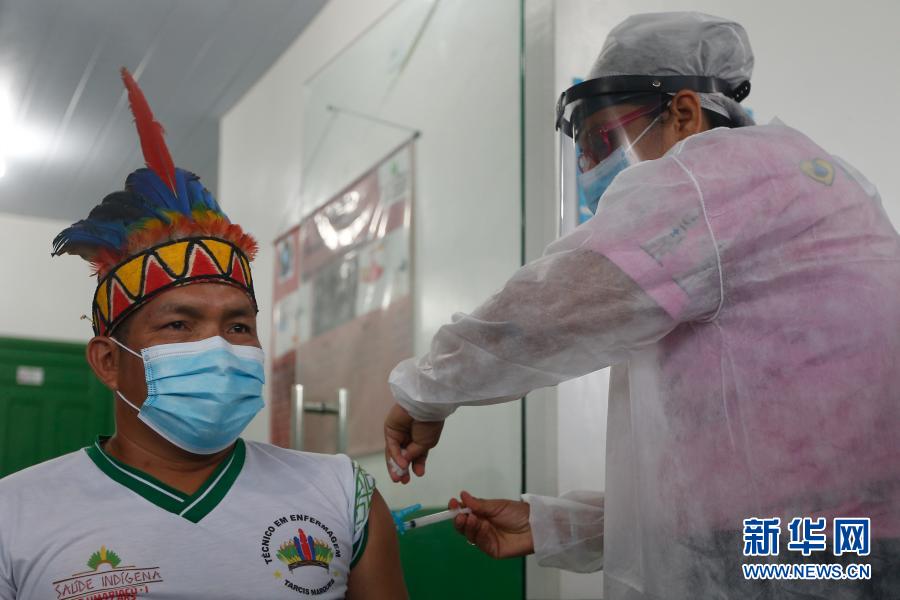 1月19日、ブラジルのアマゾナス州タバチンガで、原住民に中国産ワクチンを接種する医療スタッフ