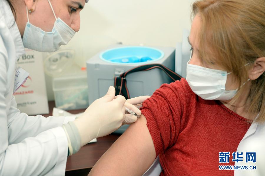 1月18日、アゼルバイジャンの首都バクーで、中国科興公司が生産した新型コロナワクチンを接種する医療スタッフ