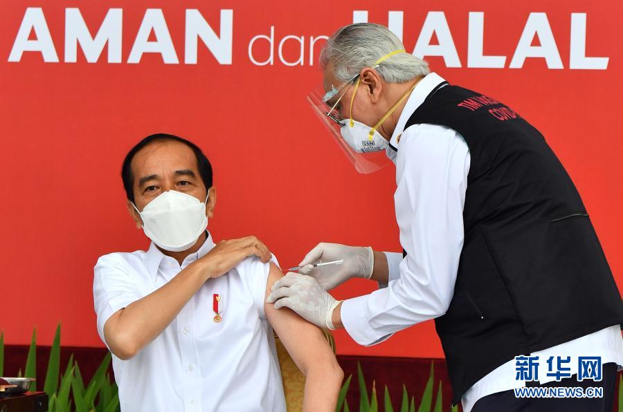 1月13日、インドネシア・ジャカルタの大統領府で、中国産ワクチンを接種するジョコ・ウィドド大統領