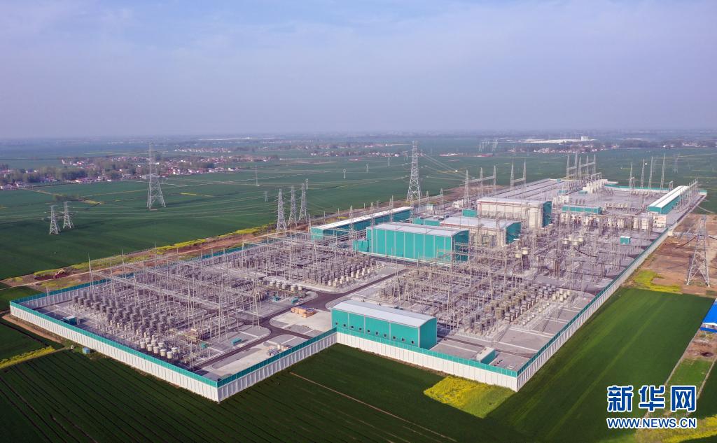 青海―河南±800キロボルト特別高圧直流送電プロジェクト豫南交流・直流変換変電所(2021年4月10日、ドローンで撮影)