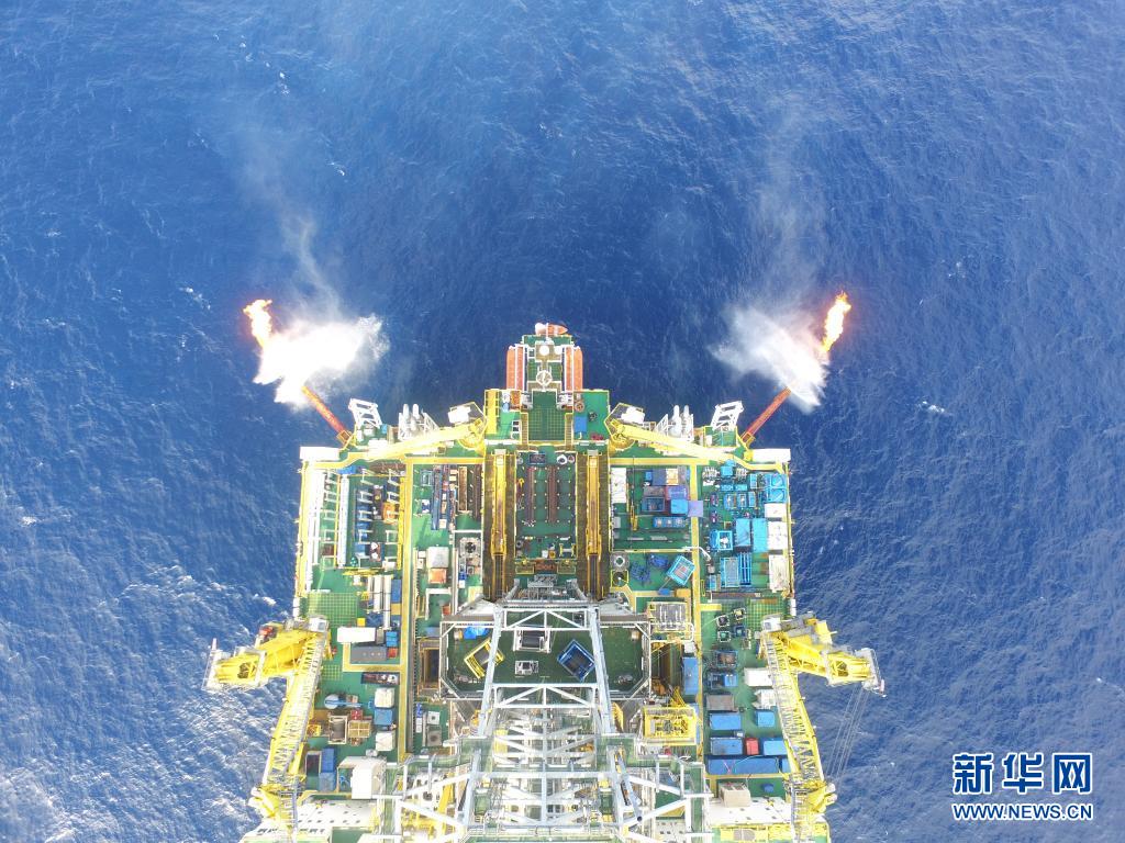 中国海域天然ガス水和物第2ラウンド試験採取プラットフォーム「藍鯨2号」から噴出する炎(2020年3月25日、ドローンで撮影)