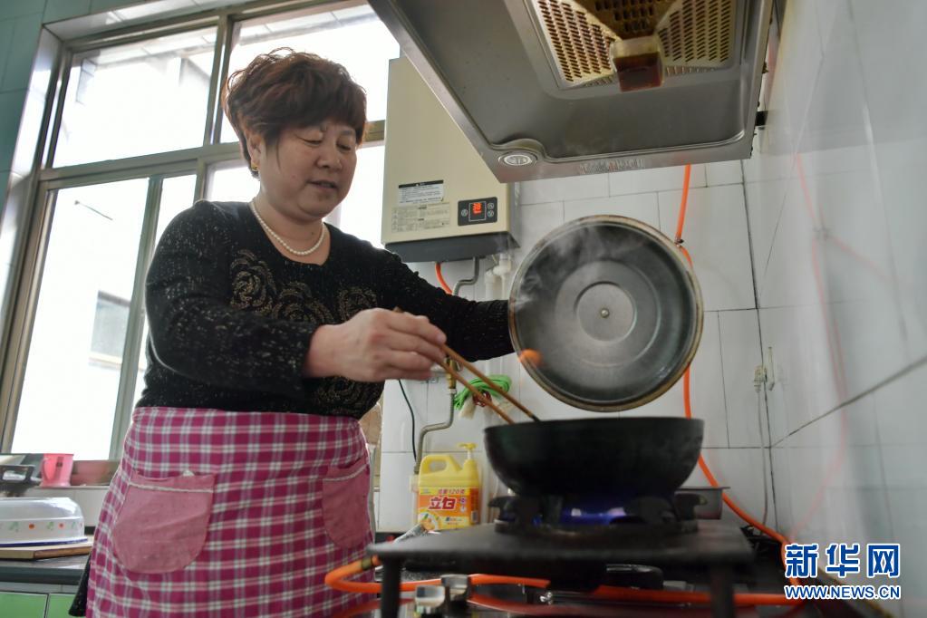 炭層メタンガスを燃料としたガスコンロで食事を作る山西省沁水県李荘村の村民の韓臘平さん(2019年10月29日)