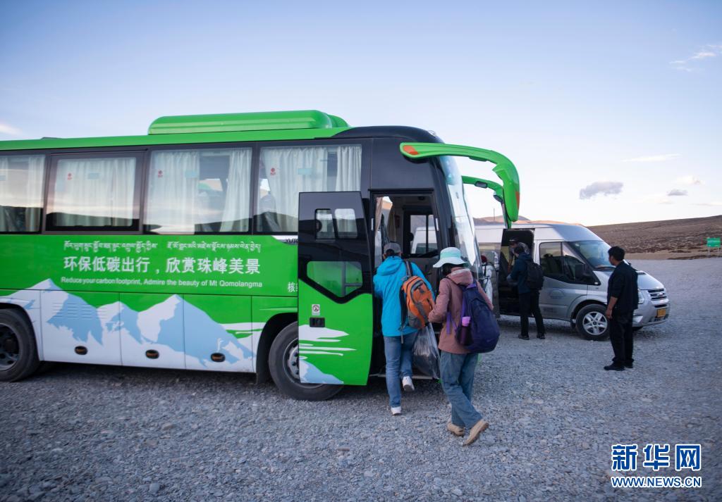 チョモランマの駐車場でエコバスに乗り換える観光客(2019年5月16日)
