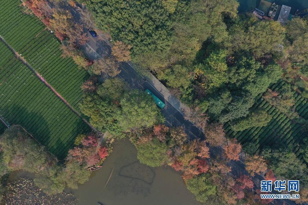 杭州西湖の龍井路を走行する純電気バス(2019年11月21日、ドローンで撮影)