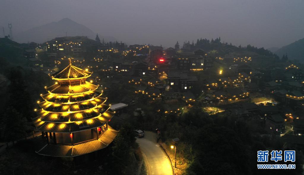 広西チワン族自治区柳州市三江トン族自治県八江鎮布央村で、ソーラー街灯と鼓楼のソーラー照明灯が村の夜を明るく照らしている(2020年12月28日、ドローンで撮影)