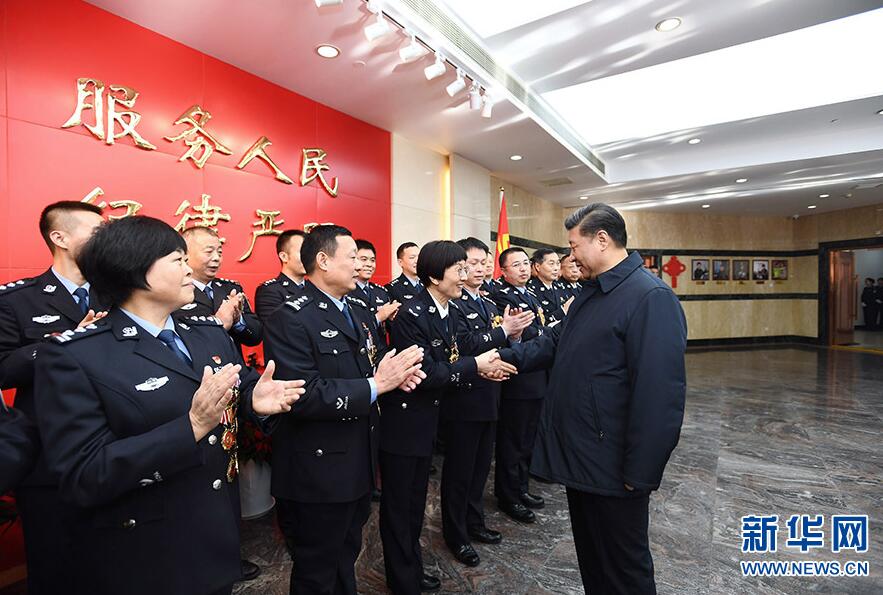 1日午前、北京市公安局で公安英雄模範や警察代表と握手を交わし、全国の公安・警察関係者に新年の祝福を行う習近平総書記。