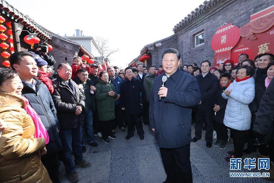 1日午前、前門東区草廠四条胡同で地元の人々に新年の挨拶をするとともに、全国の各民族の人々に向けて新年の祝福を行う習近平総書記。