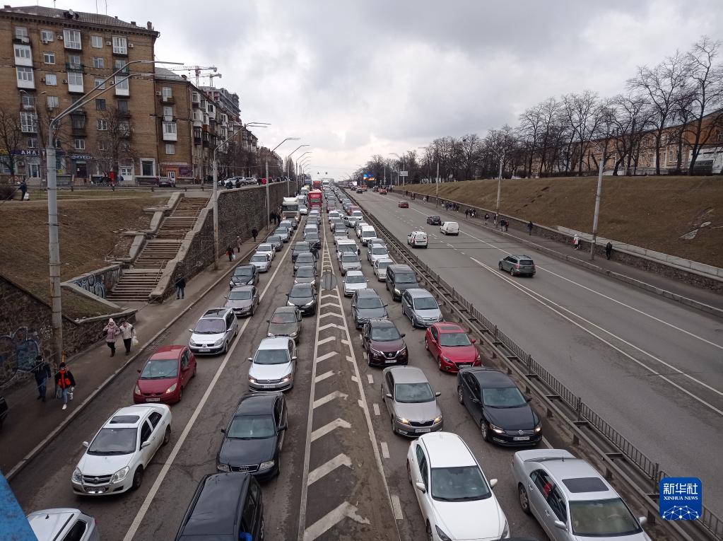 ウクライナのキエフで24日、長蛇になる車の列。ウクライナの通信社によると、ウクライナ議会で24日、ウクライナ全土の非常事態宣言の大統領令が可決された。