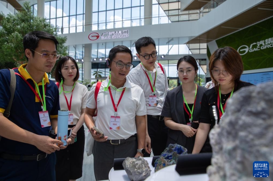 広東省広州市にある広汽研究院の電池材料展示エリアを訪れたベトナムの青年(5月21日撮影・李旭倫)。