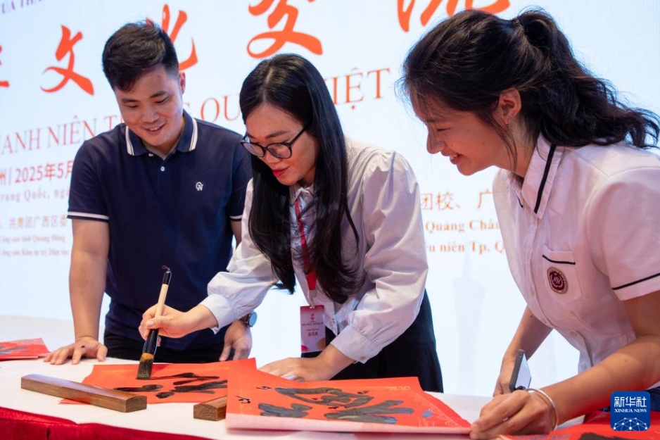 広東省広州で開催された文化交流イベントで、中国の書道を学ぶベトナムの青年(5月21日撮影・李旭倫)。