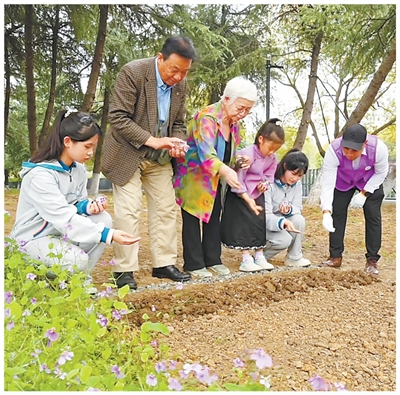 中国侵略日本軍南京大虐殺遭難同胞紀念館の紫金草花園で、紫金草国際ボランティアと共に紫金草の種をまく大門高子氏(左から3人目)。写真提供:中国侵略日本軍南京大虐殺遭難同胞紀念館。