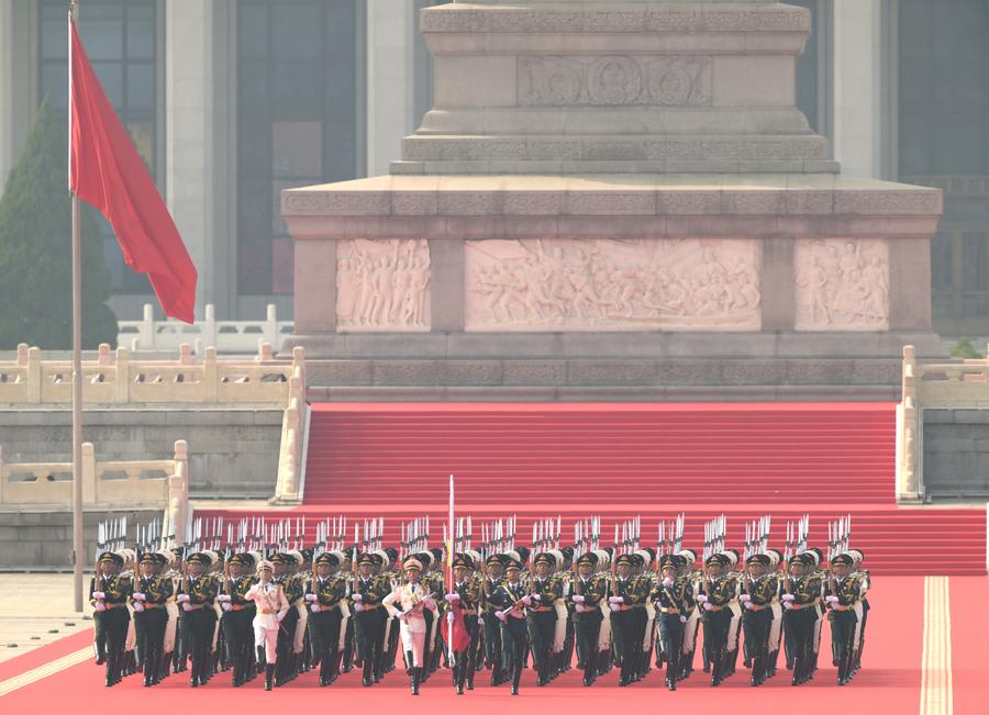 3日、五星紅旗を護衛しながら、天安門広場の人民英雄記念碑から国旗掲揚台へと行進する国旗護衛隊の将兵。(北京=新華社記者/李賀)