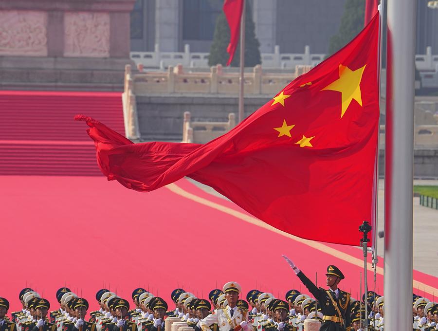 3日、北京市の天安門広場で行われた国旗掲揚式。(北京=新華社記者/邢広利)