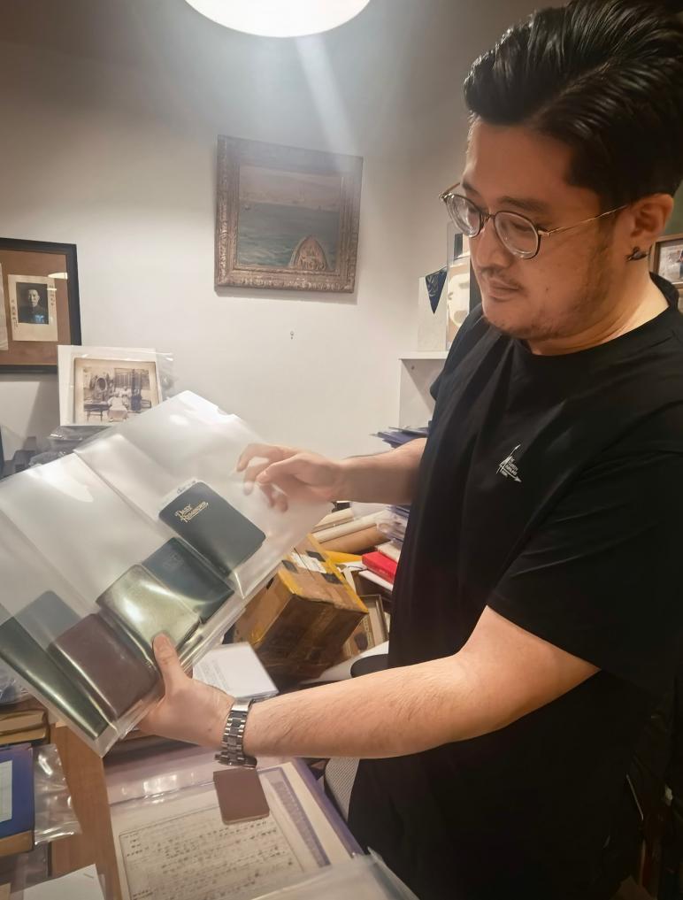 サットン日記を記者に見せる鄒徳懐氏(撮影・蒋芳)
