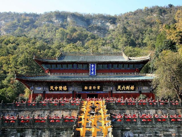 武当山は古代より道教の信者が仙境を求める理想の地である。伝説によると、玄天上帝はここで修行して昇天したという。玄天上帝を深く信仰する明の永楽帝は、武当山の道教建築の修築に莫大な国費を投入したことがある。その芸術性の高い建物は現在でもたくさん残っており、麓から天柱峰の頂上まで続く青石板の細長い「神道」、一本の柱に12本の梁が交差して建物全体を支える「一柱十二梁」、木造建築を模した石殿など、それらは雄大な自然に溶け込むように点在し、天然の景観となっている。