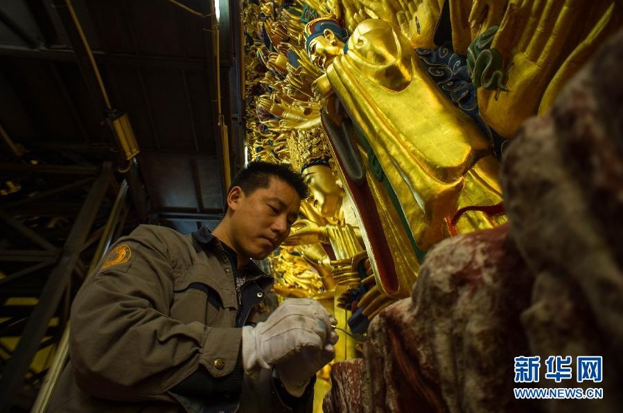 重慶市大足の千手観音像の修復は金箔を貼る作業を終え、彩色上絵は最後の下の部分の作業に入り、全作業の90%が完了した。計画では、千手観音像の修復は2015年6月に終わり、観光者に公開されることになっている。