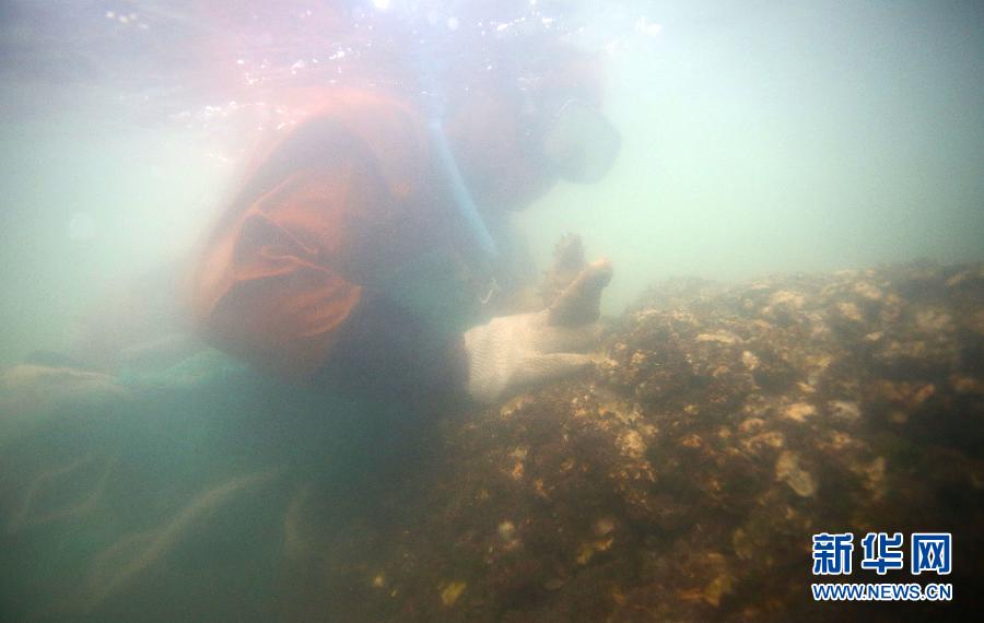 10月21日、遼寧省大連市鹿鳴島海域でナマコを捕るダイバー。