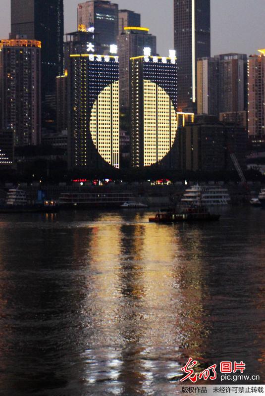 重慶市 建物の外壁に月の満ち欠けのライトアップ