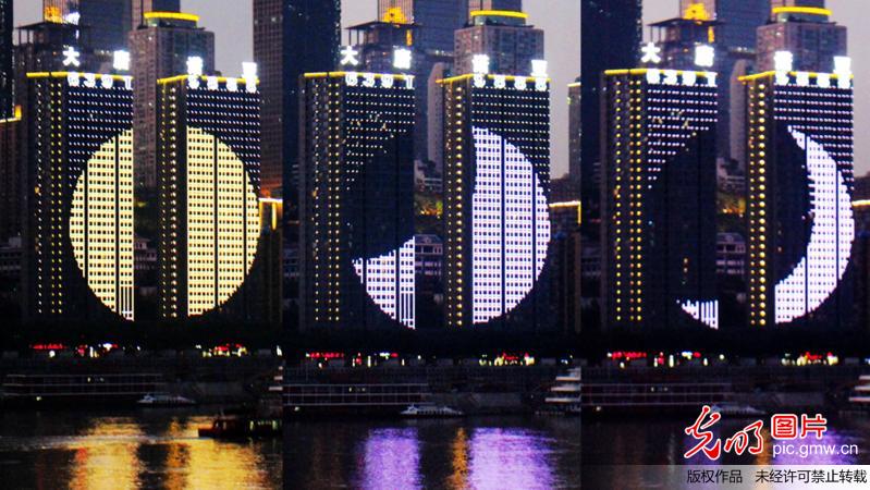 重慶市 建物の外壁に月の満ち欠けのライトアップ
