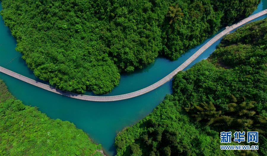水に浮かんでいるようなこの「水上桟道」は長さ約500メートルで、曲がりくねった川に沿って造られている。緑の山に囲まれ青い水の上に架かるここを歩くと、ミャオ族のふるさとの大自然の魅力を感じることができる。