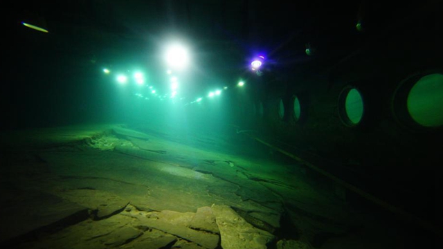 国慶節の長期連休中、重慶市涪陵区にある白鶴梁水中博物館が、各地の文化財・遺跡愛好家を集めた。写真はガラス窓から見る水中の風景。