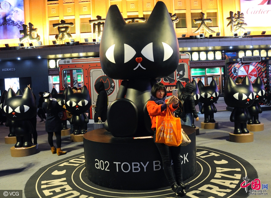 11月27日、北京市の王府井百貨大楼の前に「托比小黒」という名前の黒猫のキャラクターが大量に現れた。様々な可愛らしい姿をしたその黒猫たちは、通行人を引きつけた。