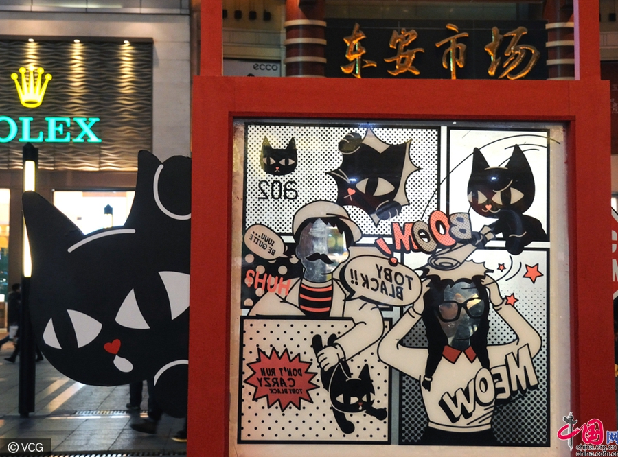 北京・王府井に「黒猫警長」大量発生 観光客が記念撮影