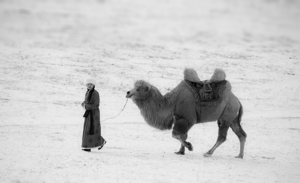 ウランブトン草原 馬が雪を踏んで走る